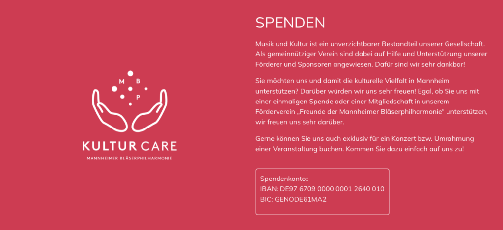 Alle Seiten und B eiträge aus dem Bereich „MBPerleben“ erhalten grundsätzlich den Abbilder „Abschnitt_Spenden“. Dabei tritt das Thema Spenden als „Marke“ KULTURCARE auf und das MBP Logo wird dabei von schützenden Händen umfasst. Quasi eine Aufforderung den Schutz und die Vorsorge für die MBP zu übernehmen und zu unterstützen bzw. zu Spenden.